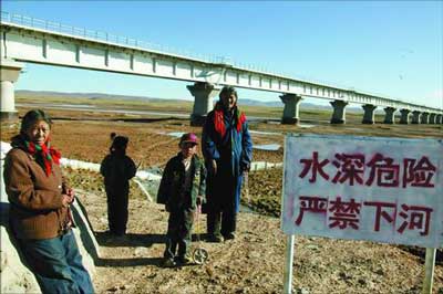 7月,雨季,沱沱河干枯的河床上一條黃毛狗在奔跑,不見寬廣河面,不見奔騰的河水,大地被烈日灼烤,裸露的河灘將水流分成幾股向東遠(yuǎn)去。全長1389.6米的長江源特大橋橫跨河上,橋北是江澤民題詞的“長江源環(huán)保紀(jì)念碑”,橋南一塊警示牌字跡清晰,上面寫著:“水深危險(xiǎn),嚴(yán)禁下河。”
