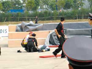 據(jù)目擊者小陳表示,他當(dāng)時(shí)正在觀看專(zhuān)業(yè)車(chē)手試駕表演,突然聽(tīng)見(jiàn)人群一陣騷動(dòng),扭頭一看,正好看到在非專(zhuān)業(yè)車(chē)手試駕區(qū)的一輛銀色越野車(chē)沖向看臺(tái)。當(dāng)時(shí),看臺(tái)上坐著一男一女兩人,身穿白衣上衣灰色褲子的青年男子閃避不及,被車(chē)撞飛了出去,“飛到20米開(kāi)外”。另一名目擊者表示,當(dāng)時(shí)試駕車(chē)上坐著一名白衣男子,在車(chē)輛失控前,他正準(zhǔn)備急剎右轉(zhuǎn),由于車(chē)速太快剎車(chē)不及,車(chē)子失控沖向了看臺(tái)。