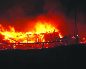 就在船主專心致志捕魚之際,突然他感到江面映出火苗的光亮;仡^一看,只見船艙里冒出一片火來(lái),“不得了,怎么失火了?”船主大吃一驚,連忙丟下漁網(wǎng),拎起一桶水就潑過(guò)去,但杯水車薪,根本不管用,火勢(shì)越來(lái)越大,他將帶繩的桶扔到江里,想從江里打水上來(lái)?yè)浠穑沒(méi)等打上來(lái)第一桶水,剎那間,整個(gè)船艙就成了一片火海。由于火勢(shì)兇猛,他的頭發(fā)眉毛都被燒焦了?粗矍八袞|西都著火了,他意識(shí)到還是逃命要緊,被迫棄船,轉(zhuǎn)身向船頭跑去,對(duì)著江里的棧船就跳了過(guò)去。船主剛跳上棧船,就聽后面“轟”的一聲巨響,放在船艙里的那桶柴油也被燒著了。