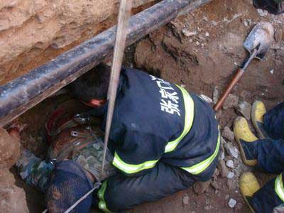 接到報(bào)警的張家口市公安消防支隊(duì)橋東大隊(duì)特勤中隊(duì)的官兵迅速趕到現(xiàn)場(chǎng)。從目擊者處了解的情況是,塌方時(shí)有5名施工人員正在一坑道內(nèi)進(jìn)行挖掘作業(yè),全部被埋在下面。其中三人被埋的深度較淺,兩人較深,土層厚度約有兩米。