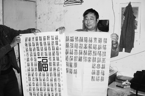 為了感謝退休教師對他的厚愛,僅有小學文化水平的男保姆放棄了工作,專心臨摹老先生的書法半年之久,并于幾天前獨自完成了一幅“百福圖”。