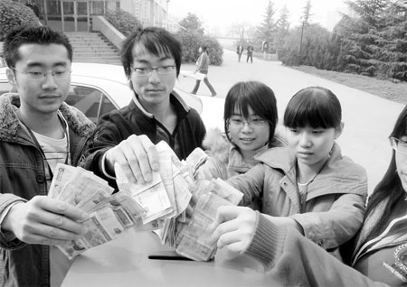 11月30日上午,西北工業(yè)大學(xué)明德學(xué)院的廣播里開(kāi)始播放《陽(yáng)光報(bào)》和西安騰訊網(wǎng)關(guān)于孔靜救母的報(bào)道,去飯?zhí)贸燥埖膶W(xué)生走到募捐處排起長(zhǎng)隊(duì)捐錢,100元、50元、10元、2元,校友們紛紛將節(jié)省下來(lái)的錢投到募捐箱里,。一名大一女生抹著眼淚說(shuō):“一個(gè)剛畢業(yè)的大學(xué)生,遇到這種事情也太難了,每天少吃一個(gè)菜,也要為孔靜姐姐捐些錢!30日下午,馬老師等人帶著全校師生的捐款14183.4元,送到了交大一附院的病房,孔靜不住地擦眼淚。