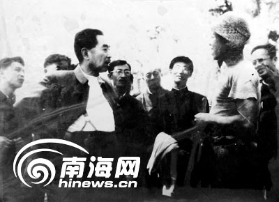 上午,身穿深灰色中山裝的周總理來到農(nóng)場(chǎng)橡膠園——這是儋縣愛國華僑1919年從南洋經(jīng)過千辛萬苦引種成功的,叫“天任”、“蔡惠”膠園,它是新中國發(fā)展橡膠主要的采種基地。