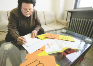 說到去年長(zhǎng)春舉辦亞冬會(huì),姜淑蘭就想志愿帶外國(guó)友人看看美麗的長(zhǎng)春,但對(duì)外語一竅不通,所以這個(gè)愿望只能作罷。直到兩個(gè)月天前發(fā)生的一件事情,才又堅(jiān)定了老人學(xué)英語的決心。那天一個(gè)黑人小伙子焦急地跑到老人面前,嘰里呱啦地說了一通,老人很無奈地?fù)u搖頭。老人當(dāng)時(shí)就想,要是自己懂英語,那該有多好。所以從第二天開始,姜淑蘭找孫女要來了英語課本,自己在家閉門造車,老人把26個(gè)英文字母倒是認(rèn)全了,但字母組合到一起,老人就咋也整不明白了。所以老人開始上街尋找外語學(xué)習(xí)班。但沒想到找到的前兩個(gè)學(xué)習(xí)班都因?yàn)槔先四昙o(jì)太大,沒有接收她。后來老人就將自己的年齡隱瞞了10歲,但仍然沒有人收她。老人依舊倔強(qiáng)地認(rèn)為自己不但能學(xué)會(huì)英語,并且能和年輕人一樣能學(xué)好。 (記者 蔡錚 陶彬)