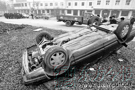 民警在國(guó)道上查車,追趕一輛轎車1000多米后,把轎車擠翻。司機(jī)在車?yán)锖熬让,民警卻不管不問,直接離開。上百名群眾氣憤不已,堵截肇事警車。