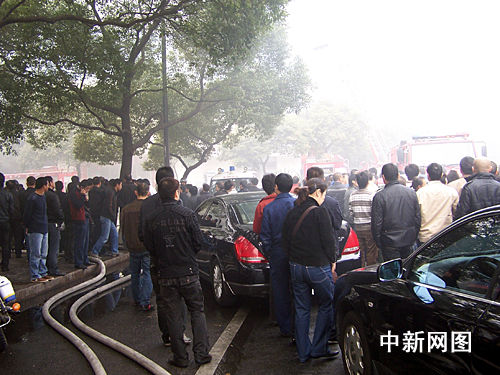 記者離火場五百米的溫州小南門即能聞到刺鼻的煙味,記者趕到現(xiàn)場時,已經(jīng)有十幾輛消防車及救護車到場,街道上到處是水,留下滅火后的痕跡。目擊者告訴中新社浙江分社記者,火是從一樓東面的花店開始的,隨后蔓延到二樓;記者看到著火的溫富大廈二樓是一家娛樂城,娛樂城正不斷往四周冒著濃煙,還有消防車架起云梯從東面和南面用高壓水槍往著火樓層里噴水滅火。