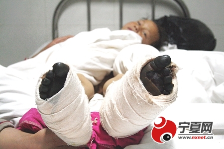 據(jù)楊二喜的姐姐楊銀蓮介紹,她們家住在西吉縣興盈鄉(xiāng)引黃溝村,那里常年干旱,家里的幾畝旱地是連年歉收,加上父親患有眼疾視物不清,母親神智低下,家庭生活非常困難。10年前,楊銀蓮嫁到了離家不遠(yuǎn)的一個(gè)村子。今年11月24日早晨,她父親急急忙忙到她家尋找母親和弟弟,她才得知母親和弟弟在頭一天就不見了。得到這一消息,鄰居、親戚20多人到處尋找,可是找了兩天都沒有消息。經(jīng)過商議,人們兵分幾路繼續(xù)尋找。11月26日,當(dāng)人們找到離家數(shù)十公里的白城村時(shí),一位老大爺說,11月25日,一個(gè)50多歲女人背著一個(gè)男孩在他家討過水喝。按照老大爺描述,證實(shí)這倆人正是他們苦尋多天的親人。11月27日,被困5晝夜的母親和弟弟終于在附近的一座山上找到了。楊銀蓮回憶說:“當(dāng)時(shí)母親和弟弟正坐在一個(gè)土坑里,弟弟僅穿著一件薄毛衫,臉凍得發(fā)紫,鞋只剩下一只。弟弟看見我的第一句話便說‘大姐,我快凍死了”,回家后給弟弟換衣服時(shí)發(fā)現(xiàn),弟弟的雙腳已凍成了黑色。楊二喜告訴記者:“媽媽背我出來要飯,不知不覺就迷了路,一只鞋也不知道啥時(shí)丟了,我的腳在出門的第二天便失去了知覺,這5天中,我們每晚都睡在草堆里,陪伴我的除了媽媽,就是饑渴和寒冷!