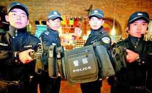 按照公安部《公安單警裝備配備標準》通知精神,今年以來,在市委、市政府和上級公安機關的支持下,市公安局率先為特警部門配備手銬、急救包、警用水壺、強光手電、收縮警棍、單警背囊、催淚噴射器、對講機標準化武裝裝備。