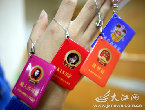 證件,人們?nèi)粘I钪凶钇匠R沧畈豢苫蛉钡挠闷罚缃癖痪W(wǎng)絡(luò)惡搞之風(fēng)席卷:“戀愛(ài)證”、“帥哥證”、“結(jié)婚證”、“處女證”等令人啼笑皆非的“惡搞證件”層出不窮。很多學(xué)生將它們掛在手機(jī)、鑰匙或背包上,將之視為一種新的校園時(shí)尚元素。記者發(fā)現(xiàn),被惡搞的紅色“結(jié)婚證”與真正的結(jié)婚證很相似,內(nèi)頁(yè)可以填寫(xiě)兩個(gè)人的姓名,只是封面上印著“中國(guó)婚姻聯(lián)盟頒發(fā)”字樣。在“光棍證”、“流氓證”等證件中,同樣有大量的惡搞內(nèi)容,有些十分低俗。懷揣著“流氓證”的南昌市某小學(xué)三年級(jí)學(xué)生萬(wàn)兵(化名)稚氣未脫地對(duì)記者說(shuō):“我是流氓我怕誰(shuí),拿著它多帥。