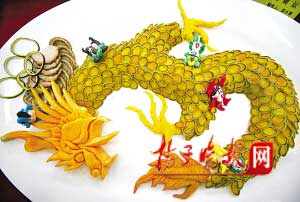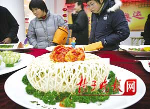 走進(jìn)展廳,記者就被展臺(tái)上的菜肴所吸引。在比“雕工”的展區(qū),南瓜、蘿卜、山芋等普通蔬菜被廚師們用妙手雕刻成龍、鳳、仙子等各色造型,刻工精細(xì),龍須、鳳尾上的羽毛,甚至是一根根的。已有10年廚齡的宋師傅告訴記者,作品里除了南瓜、還有紅、青蘿卜、山芋等食材,一共刻了三個(gè)小時(shí)才完工。在比“擺盤”的展區(qū),不少菜肴都是以?shī)W運(yùn)為主題,用面條搭建的“鳥巢”體育場(chǎng),形象逼真。用白色白玉糕、綠色麥香糕、糯米元宵擺出的五環(huán)體育場(chǎng)惟妙惟肖,“操場(chǎng)”外五位用糯米做的福娃更是可愛喜人,據(jù)介紹,從蒸糕點(diǎn)到擺盤,廚師一共花了九小時(shí)呢,香噴噴的米糕看著都眼饞。