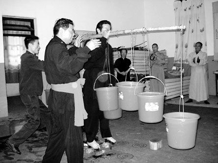 陳師傅說(shuō),除了踏刀提水外,他還有金剛腿、金槍刺喉等絕活!斑@些功夫源自少林。運(yùn)功后,身體的肌肉會(huì)變硬,可抵擋銳器!彼f(shuō),最先練踏刀提水時(shí),是嘗試性地站在刀刃上,當(dāng)時(shí)腳也會(huì)被割傷。隨著時(shí)間推移,腳皮越練越厚,在刀刃上堅(jiān)持的時(shí)間也越來(lái)越長(zhǎng)。