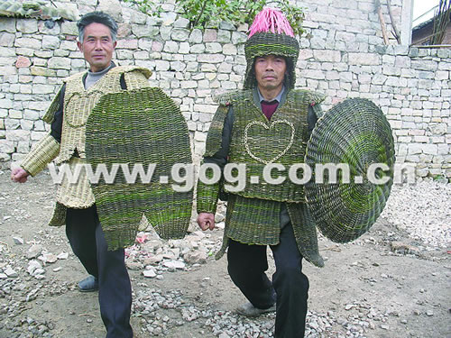 近日,被蜀國丞相諸葛亮用火燒死的藤甲兵在安順“復(fù)活”(如圖)。記者昨日在安順開發(fā)區(qū)歪寨村看見,該村村民根據(jù)老人的回憶復(fù)制的兩副藤甲已經(jīng)全部完成,村民穿在身上,活像三國時期曾大敗蜀軍的“藤甲兵”,令人驚奇不已。