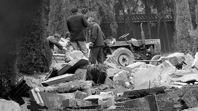 該陵園的工作人員不無(wú)痛心地告訴記者:這里烈士的墓碑和墓身,是先用大型裝載機(jī)推倒,再由人工打碎裝車?yán)叩!跋胂氚,烈士的遺骨怎能承受大型裝載機(jī)野蠻的傾軋!”