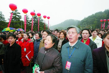 “毛主席,人民世世代代懷念您!”《東方紅》的音樂聲響起,在韶山少年合唱隊的領唱下,現場萬余人都隨著旋律放聲高唱那首在心中回蕩了千百遍的頌歌:東方紅,太陽升,中國出了個毛澤東……