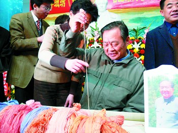 本報韶山訊(記者 劉炬 林俊 陳飛)昨日下午,《偉大領袖毛澤東》絨繡像啟繡儀式在韶山毛澤東同志紀念館舉行。毛澤東堂侄毛岸平在絨繡工藝師的指導下為繡像啟繡第一針。這件精美的手工藝品,將在明年毛澤東誕辰115周年時完成,屆時,它也將成為毛澤東文藝館落成后的首批展品。