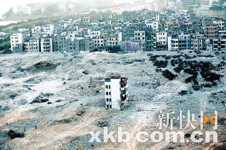 曾經(jīng)密密麻麻蓋滿了“握手樓”的獵德村,迅速成為一片空曠的大工地,村屋幾被拆完。然而,殘?jiān)珨啾谥,一棟樓房依然聳立,從高處看去很是顯眼。