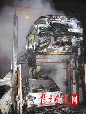 昨天(4日)凌晨時(shí)分,記者接到市民李先生報(bào)料后迅速驅(qū)車趕往現(xiàn)場(chǎng),過了機(jī)場(chǎng)高速翠屏山匝道口時(shí),已經(jīng)能聞到空氣中有一股濃濃的焦味。又開了兩公里后,道路開始擁堵起來,不久車輛便完全停滯下來,無奈之下記者只得棄車徒步趕往現(xiàn)場(chǎng)。直至兩公里開外,終于看到了失火的運(yùn)輸車,只見運(yùn)輸車車廂已經(jīng)被濃煙籠罩,車廂里不停傳出“噼里啪啦”的爆響,從車廂縫隙處可見紅光閃閃。不一會(huì)兒,“砰砰”兩聲巨響傳出,車輪燒爆后炸破了車廂擋板。記者這才發(fā)現(xiàn)8輛寶馬轎車正在火籠中“煉獄”,輪胎、塑料部件已經(jīng)在燃燒,無人敢靠近。交警為防止車輛爆燃,危及過往車輛,封閉了所有往機(jī)場(chǎng)方向的入口,并對(duì)現(xiàn)場(chǎng)車輛和人員及時(shí)疏散。該運(yùn)輸車兩側(cè)油箱裝滿了柴油,火勢(shì)如無法得到有效控制,繼續(xù)下去,分為兩層擺放的轎車一旦轟然坍塌,恐怕會(huì)造成油箱爆炸。不久,又有兩輛大型消防車趕到現(xiàn)場(chǎng)增援。消防員冒險(xiǎn)撬開車廂擋板,用5條水龍對(duì)火舌猛烈噴水。直至凌晨1點(diǎn)左右,火勢(shì)才被完全控制,但總價(jià)值400多萬的4輛寶馬5系和4輛寶馬3系轎車幾乎成了一堆廢鐵。