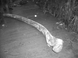 據(jù)煙臺晚報報道,2007年10月一個海陽市民,在海邊撿到一根奇大的魚骨,呈灰白色,長2.3米,厚度約0.15米,重約40公斤。專家初步察驗后稱,這是一根鯨魚的肋骨(也就是說是一根“魚刺”),從這根肋骨推測,這條鯨魚“生前”體重至少有幾十噸。