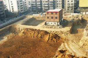 1月8日,河南省焦作市某舊城改造工地上矗立著孤零零的一棟樓。焦作市升恒房地產(chǎn)開發(fā)公司于2003年啟動(dòng)舊城改造項(xiàng)目的開發(fā),由于一戶搬遷戶要求賠償數(shù)額同開發(fā)商不能達(dá)成一致,成為了堅(jiān)持到底的“釘子戶”。幾年來,雙方始終未達(dá)成協(xié)議。耽誤不起工期的開發(fā)商先行對(duì)其他位置進(jìn)行開發(fā),從而形成了如今的場(chǎng)景。宏航 攝