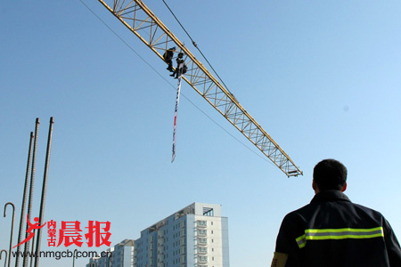 昨日上午9時(shí)30分, 在新城區(qū)新華大街富邦商務(wù)中心建筑工地上,兩名河南籍農(nóng)民工爬到距地面50米的吊臂上,欲追討欠薪。他們說施工方拖欠他們十幾萬元工錢。事發(fā)后,民警及時(shí)趕到現(xiàn)場,緊急聯(lián)系工程負(fù)責(zé)人。與此同時(shí),呼市勞動(dòng)部門也介入調(diào)查處理。4個(gè)小時(shí)后,這兩名農(nóng)民工才從塔吊上下來。