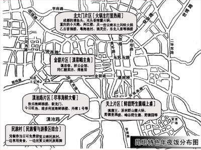 北大門區(qū)域的品牌火鍋最為集中,成都的譚魚頭、光頭香辣蟹火鍋,重慶的小天鵝、兩江樓檔次高、口感好、環(huán)境好、服務(wù)好。此外,這個區(qū)域的酒樓風(fēng)格最豐富,乙古香酒樓(滇味精品家宴)、粵海漁村(老牌平價海鮮酒樓)、酒靈莊(騰沖風(fēng)味)、東北人家(東北風(fēng)味)等等,不同的風(fēng)味,可讓你吃不膩。10人桌收費標準視實際菜品確定,人均消費30-80元。