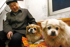 黃平指著一條黃色的京巴狗說:“它叫點(diǎn)點(diǎn)!薄包c(diǎn)點(diǎn)”穿著花毛衣,肚子幾乎貼地,好動的它總是圍著主人轉(zhuǎn),時而作揖,時而又咬一下旁邊的“多多”!岸喽唷笔且粭l白色的藏黃犬,是黃平專門從康定買回來的,很忠心。“多多”體型偏胖,性格溫馴,整個采訪過程中,它始終坐在黃平身旁,睜眼望著主人。