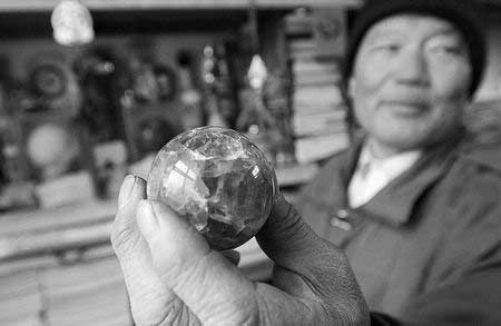 在郭國謙收藏室中任意掂出一件東西,都有一段故事。在收藏室一角的架子上,一枚直徑約有25厘米的綠色圓球引人關(guān)注,郭國謙將其拿至暗處,只見圓球發(fā)出熒熒微光!斑@就是人們常說的夜明珠。”郭國謙說。