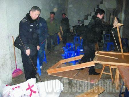 從去年5月起,派出所就經(jīng)常接到群眾舉報(bào),但每次去查賭,都逮不到人。“這些人鬼得很,反偵探能力非常強(qiáng)!本讲粌H逮不到組織賭博的人,就連提供賭場(chǎng)的門(mén)面老板都找不到,“這個(gè)門(mén)面都不知道轉(zhuǎn)了多少次手了,而且也沒(méi)有人愿意說(shuō)實(shí)話(huà)!毕群笈芰藥滋於紱](méi)有找到人,警方于是開(kāi)始采取搜繳賭具的方法,每出一次警,就叫來(lái)三輪車(chē)把桌椅板凳全部拉到派出所的一個(gè)倉(cāng)庫(kù)里。不到10天,倉(cāng)庫(kù)都堆滿(mǎn)了。正是因?yàn)閭}(cāng)庫(kù)都裝滿(mǎn)了,現(xiàn)在才采取砸爛賭具的辦法。