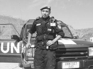 他今年36歲,曾兩次出任國際維和警察, 重復(fù)經(jīng)歷了貧窮、戰(zhàn)亂、恐怖和險惡的生死考驗,出色地完成了維和任務(wù),榮獲兩枚聯(lián)合國和平勛章。他叫吳強(qiáng),畢業(yè)于吉林大學(xué)計算機(jī)系和法學(xué)院,獲計算機(jī)專業(yè)學(xué)士學(xué)位和法律專業(yè)碩士學(xué)位。國家一級運(yùn)動員。1996年參加公安工作,是我。ㄗⅲ杭质。┦孜粐H維和警察。目前任省公安廳辦公室副主任,指揮中心副指揮長。前不久吳強(qiáng)榮膺第18屆“中國十大杰出青年”的殊榮。