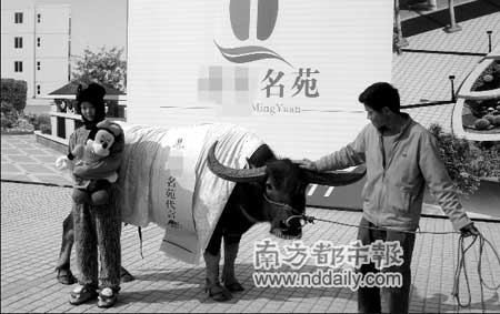 昨日中午12時(shí)許,一頭盛裝打扮的大水牛站在一輛貨車(chē)上,沿珠海斗門(mén)城區(qū)和新青工業(yè)園一路游行。笨拙的水牛也能成為大明星?新年伊始,不甘寂寞的珠海地產(chǎn)富豪賈永清又有新動(dòng)作,自稱(chēng)為了活躍目前相對(duì)低迷的房地產(chǎn)市場(chǎng),以每天300元的價(jià)格從當(dāng)?shù)剞r(nóng)戶(hù)家找來(lái)一頭大水牛,為自己的樓盤(pán)做起形象代言,并在牛身上披紅掛彩,敲鑼打鼓沿街游走,向路人拜年。