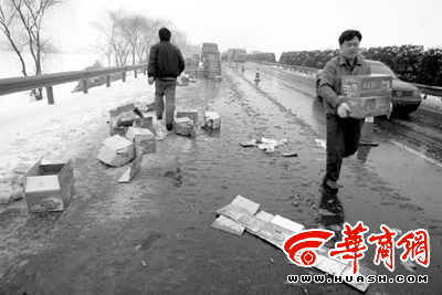 昨日清晨,在西潼高速新豐段,發(fā)生一起4車追尾交通事故,造成一死兩傷。就在司機(jī)忙著搶救事故傷者時(shí),有些路過(guò)的客車和貨車上的人,卻趁機(jī)搶走了一輛卡車上的30余箱蘋(píng)果。