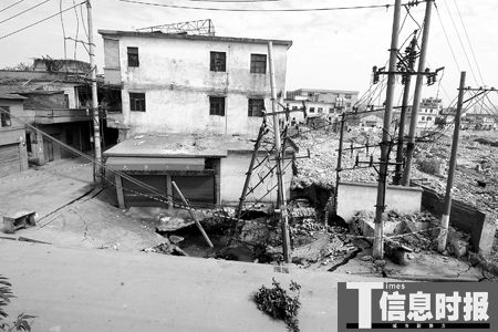 “這些房子是慢慢下陷地面的!弊≡谖髋d街的一名士多店老板阿牛說,早上7時左右,他看見那些房子突然開裂,接著就看見這些房子逐漸下沉,隨后“轟”的一聲,變壓器倒了,地面像地震一樣開出了一個巨大的窟窿,之后窟窿擴大蔓延。