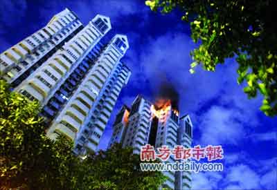 樓下集中了10輛消防車,消防隊(duì)一度啟用其中兩臺(tái)高壓水炮,但因水壓不夠而作罷,大火最后在晚上8時(shí)30分被撲滅。(記者 肖海坤)