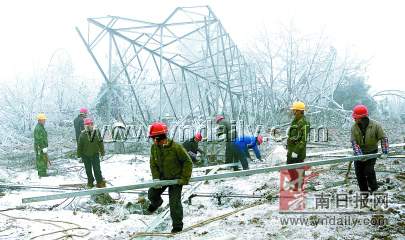 由于受強冷空氣影響,連日來,昭通大部分地區(qū)持續(xù)普降凍雨、大雪,致使昭通電網(wǎng)遭遇10年不遇的覆冰自然災(zāi)害,造成昭通大面積停電,并嚴(yán)重威脅著內(nèi)昆線鐵路運行和溪洛渡電站施工用電。目前,威信、鎮(zhèn)雄、鹽津3縣已經(jīng)與云南電網(wǎng)脫離,孤網(wǎng)運行;鹽津紅原電石廠、水富金明化工廠已被迫停產(chǎn)。
