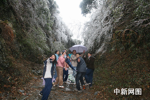 在遠(yuǎn)近聞名的梅關(guān)古道兩側(cè),目光所及都是一片銀枝玉葉、冰掛霧凇,樹上早已綻放的千姿百態(tài)、婀娜多姿的白梅、臘梅、綠梅與晶瑩的冰雪花交輝相映,讓人眼花繚亂。在“嶺南第一關(guān)”門樓前,一群群年輕人絲毫不懼嚴(yán)寒,或相爭取景拍照留影,或盡情玩耍放聲大喊!罢媸且馔獾捏@喜,沒想到這次到南雄來休閑正好遇上了這場雪。古道踏雪賞梅還是第一次”一群從廣州來的游客興奮不已地告訴記者。