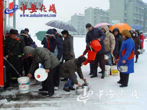 受暖濕氣流和冷空氣的共同影響,25日以來(lái),安徽省銅陵市再次出現(xiàn)連續(xù)性強(qiáng)降雪,氣溫也繼續(xù)下降,最低達(dá)零下4℃,全市出現(xiàn)了長(zhǎng)時(shí)間的凝凍天氣。從26日上午開始,市內(nèi)多條供水主管道相繼被凍結(jié)或爆裂,上萬(wàn)居民陷入了無(wú)水可用的困境。銅陵市消防支隊(duì)及時(shí)啟動(dòng)了雨雪災(zāi)害搶險(xiǎn)救援應(yīng)急預(yù)案,先后出動(dòng)4輛消防車、20余名官兵,冒著大雪和嚴(yán)寒,往返于取水點(diǎn)與居民區(qū)之間,為居民們送來(lái)了12車、共70噸清水,解決了居民們的燃眉之急。