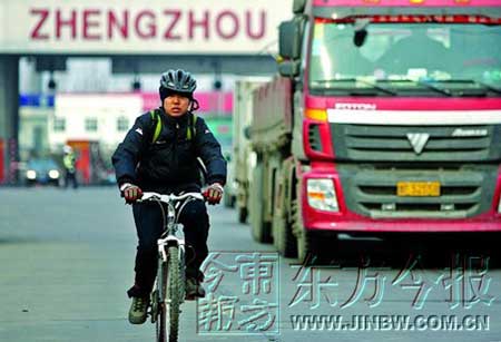 昨日中午12時20分,鄭州北郊黃河大橋收費站,當(dāng)一個戴著頭盔身背大包的小伙子騎著自行車駛出收費站時,早已在此等候的親朋好友發(fā)出一陣歡呼:高富松是全程騎著自行車從北京返回鄭州的,這么惡劣的天氣,這個從未受過相關(guān)訓(xùn)練的年輕人用了一周才走完。