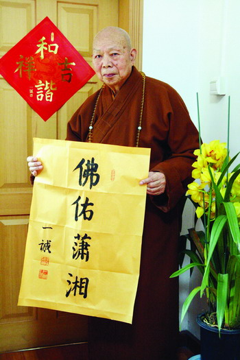 坐在北京廣濟(jì)寺中國佛教協(xié)會辦公室里,全國政協(xié)常委、中國佛教協(xié)會會長一誠大和尚不禁面露愁云,為家鄉(xiāng)湖南遭遇雪災(zāi)而擔(dān)憂著。80高壽的一誠大和尚用稍微有點顫抖的手提起了筆,飽含深情地寫下了“佛佑瀟湘”四個大字,“祈愿家鄉(xiāng)湖南能永離災(zāi)難,人們幸福安康”。為此他還準(zhǔn)備為家鄉(xiāng)捐出5萬元。