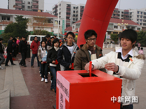 中新網(wǎng)韶關(guān)2月10日電 (馮昶 朱祖純 曾誠) 大年初三,廣東南雄市三影塔景區(qū)廣場內(nèi)人流涌動(dòng),一場聲勢浩大的“我與災(zāi)民心連心”募捐活動(dòng)正在舉行,來自各條戰(zhàn)線的干部、企業(yè)等數(shù)千人紛紛伸出援助之手。引人注目的是一批當(dāng)?shù)卦谕獯蚬さ那嗄耆、學(xué)生和社團(tuán)組織自發(fā)捐款,用真情表達(dá)對今年冰雪災(zāi)區(qū)民眾的一片愛心。
