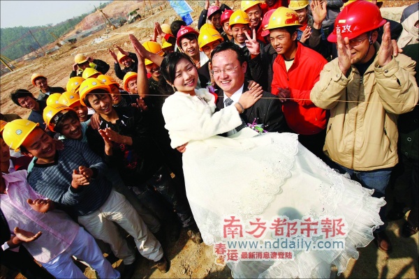 因為大運會建設工程工期緊,這個春節(jié),來自深圳建筑工務署大運工程管理處的工程師高輝,昨日把原計劃在老家江西舉辦的終身大事,搬到了大運會的施工現(xiàn)場。而深圳市兩位副市長呂銳鋒、梁道行在工地上為一對新人做了證婚人。