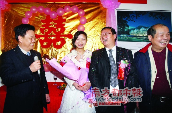 而得知這一消息后,昨日到施工工地慰問建設者們的呂銳鋒和梁道行兩位副市長,為新人們當了一回特殊的證婚人,除了給新人包上兩個大紅包,兩位副市長都祝愿新人愛情美滿,白頭偕老。