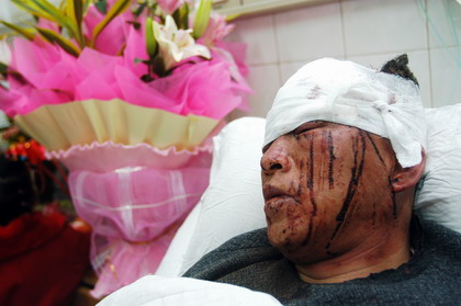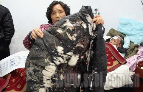 在爆炸中同樣驚魂的還有朱昆峽和老伴阮群。病床上,56歲的朱昆峽頭纏著厚厚的紗布,面部被高溫燙傷,紅腫發(fā)亮!拔覀冊缟蟿偝鲩T去給大娘過生,他在前面我走在后面。”阮群說,當(dāng)他們走到14號時,突然發(fā)生了煤氣爆炸,老伴朱昆峽頓時便不見了人影。阮群說,在慌亂的人群中突然發(fā)現(xiàn)一個滿臉是血、雙手抱著頭的人,“我說這個老頭咋沒人管喃,便趕緊上前去攙扶,才發(fā)現(xiàn)居然是自己老伴。”阮群說,爆炸來得太突然了,很多人根本來不及躲藏就被爆炸產(chǎn)生的高溫和熱浪擊翻在地,受傷者中許多人血流滿面,有的被玻璃擊中頭部和眼睛。
