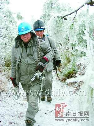 嚴(yán)重冰凍災(zāi)害天氣讓曲靖很多地方的電網(wǎng)面臨嚴(yán)峻考驗。沾益縣的冰凍尤為嚴(yán)重,轄區(qū)電力設(shè)施損壞十分嚴(yán)重。在電力抗災(zāi)搶險現(xiàn)場,記者看到厚厚的覆冰把電線壓塌,有些電桿被攔腰折斷。