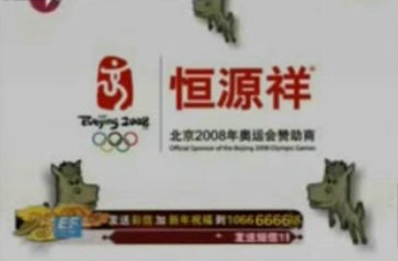 春節(jié)期間,中央電視臺、東方衛(wèi)視、湖南衛(wèi)視等播出恒源祥集團的賀歲形象廣告。廣告中,低沉的男聲反復12遍“恒源祥,北京奧運會贊助商。”童聲念出的十二生肖名稱穿插其間,從“鼠鼠鼠”、“牛牛!保钡健柏i豬豬”。廣告畫面以奧運中國印和恒源祥商標為底,十二生肖的卡通圖案依次閃過。廣告時長1分鐘。