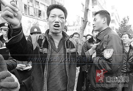 據(jù)李賢堂說,其家兄弟4人來昆明已有多年。二哥李賢友以前受過傷,醫(yī)治好后便身帶殘疾,與二嫂在昆明做米線生意。上午10點左右,他知道二哥送餌塊途經(jīng)人民東路時被城管打了,就迅速跑了來!翱吹蕉缣稍诘厣希D塊散落一地,我就跑到一輛白色面包車前,攔住去路,沒想到,七八個男子就過來打我,他們那么多人,我咋個還手,打得我頭昏眼花,我只好抓住先打我的那個不放手!