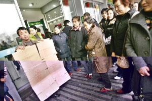 昨日中午1時許,兩名男子和一名婦女來到儲蓄所門前,高舉一個寫有“我在這里取到假錢”的紙牌子。舉牌子的男子叫汪登渝,長壽人,是進城務工的農民工!拔易蛱熘形缭谶@取了5000元準備借給小舅子,半小時后我們走到家樂福后發(fā)現(xiàn)錢是假的!蓖粽f,當時他在自動取款機上分三次取錢(前兩次各取2000元,第三次取1000元),點清數(shù)額后將現(xiàn)金和卡帶離儲蓄所,隨后來到家樂福買東西時發(fā)現(xiàn)異常,“我看到錢上的頭像是黃色的,就覺得有問題!蓖舻男【俗狱S先生說。不過,對于汪登渝半小時內的行程,只有其小舅子能夠作證。