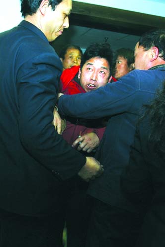 站在門外的十幾個民工看到保安動手推搡記者,就闖了進來。一穿紅色夾克的民工兩手作揖,幾次跪到地上,說“要打你們打我吧,不要打人家記者”。