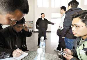 、谧蛉丈衔,在九江市德安縣公安局,該局雷政委(中)正在與當(dāng)?shù)匦叹⒅驹刚吆捅緢笥浾咭黄鸩贾眯袆臃桨浮?