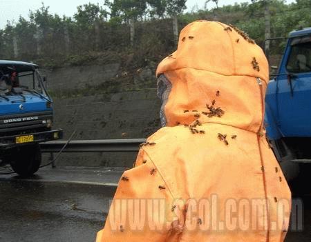 昨日上午,一輛攀枝花車牌的5噸加長大貨車,滿載150余箱(每箱5公斤約2萬余只)蜜蜂,途經(jīng)成渝高速146.5公里處時(shí),后右輪突然飛出車身,貨車側(cè)翻于公路上。車上脫箱而出的上百萬只蜜蜂,瞬時(shí)將成渝高速上空變成蜜蜂的海洋。事發(fā)后,交警、高交執(zhí)法隊(duì),以及資中消防官兵10余人聯(lián)手奮戰(zhàn)5個(gè)多小時(shí),中午1時(shí)30分,成渝高速得以恢復(fù)暢通。