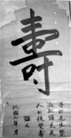昨日上午,在綿陽(yáng)市一位收藏者家中,記者見(jiàn)到其新近收藏的一件賀壽書(shū)法珍品:一張大紅榜紙(朝廷發(fā)金榜用紙)上,斗大的繁體 “壽”字,勻稱、飽滿、遒勁,十分工整。落款清楚,其中單獨(dú)成行的“孫文”兩字非常醒目(右圖)。